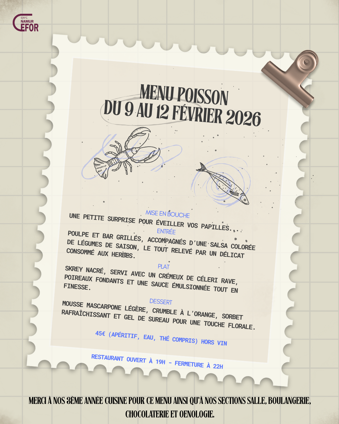 | 2026-02-09 | Semaine Printanière 09-12/02Du Lundi 09/02/26 au Jeudi 12/02/26Découvrez notre restaurant application en dégustant les produits préparés par nos Etudiants Réservations à partir du 26/01/26 : 45€ avec apéritif hors boisson _menuprintemps26.png |